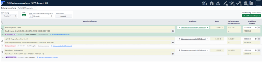 Mit der neuen Zahlungsverwaltung läuft der komplette Prozess in Flowwer. Von der ersten Prüfung bis zum fertigen SEPA-Export für Ihre Bank. Das spart Ihnen Zeit bei der Zahlungsvorbereitung, Sie verpassen keine Skonto-Fristen mehr, vermeiden Doppelzahlungen und machen deutlich weniger Fehler, weil die Daten automatisch übernommen werden.